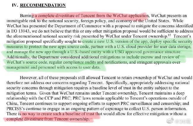 * 美国版微信的源代码交给第三方独立监管机构审查(以防止可能存在的 “后门 “)